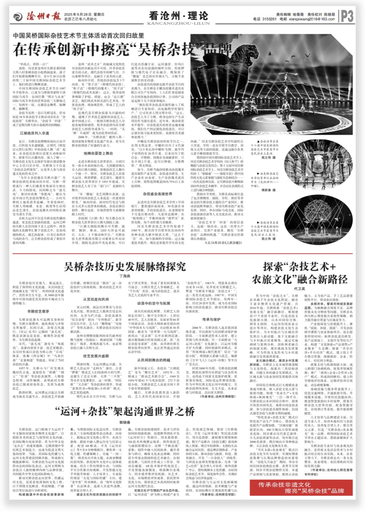面向未来,郭晓春提出,吴桥杂技要实现真正意义上的“世界语言”,必须持续推进内容、渠道与人才三方面的创新:既要将大运河文化等中国故事转化为杂技语言,也要借助TikTok等国际平台拓展线上传播渠道,更要培养一批既懂技艺又通国际的复合型人才,让吴桥杂技成为沟通中外的文化使者。该研究成果注重从学术走向实践,尝试为地方文化“走出去”提供一些接地气的、可借鉴的路径参考。沧州日报理论板块刊发了郭晓春的专题文章,进一步扩大了研究成果的社会影响力。