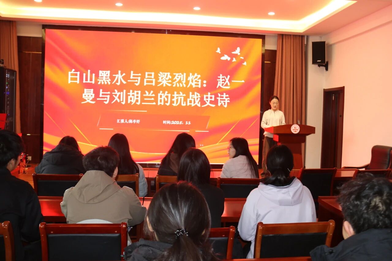 为激励青年学子赓续红色血脉,传承抗战精神,11月23日,马克思主义学院在理论大讲堂举办“红心向党”周末读书班系列活动——白山黑水与吕梁烈焰:赵一曼与刘胡兰的革命史诗。本次活动由徐佳泽主持,陈亭妤作主题汇报,学院教师郝浩博与全体入党积极分子共同参与。