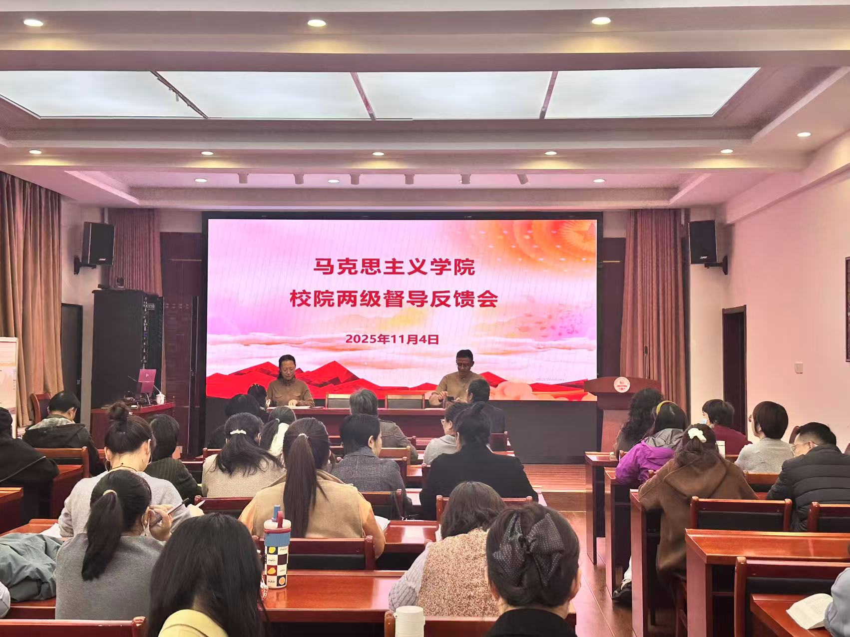 为更好地迎接教育教学审核评估工作、强化教学规范、提升思政育人成效,马克思主义学院于11月4日召开2025-2026学年第一学期校院两级督导反馈会。校级督导组专家陈玲教授、学院督导组成员及全体教师参会。院长刘贵振主持。